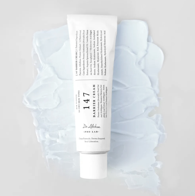 Dr. Althea 147 Barrier Cream soothes redness and irritation with Paeonia Albiflora and chamomile-derived azulene. Enriched with avocado, argan, and camellia oils plus tocopherol, it deeply hydrates while supporting anti-aging care. Featuring 1 patented ingredient, 4 nutritional extracts, and 7 hyaluronic acids, this silky, non-greasy cream strengthens sensitive skin for a calm, healthy glow.